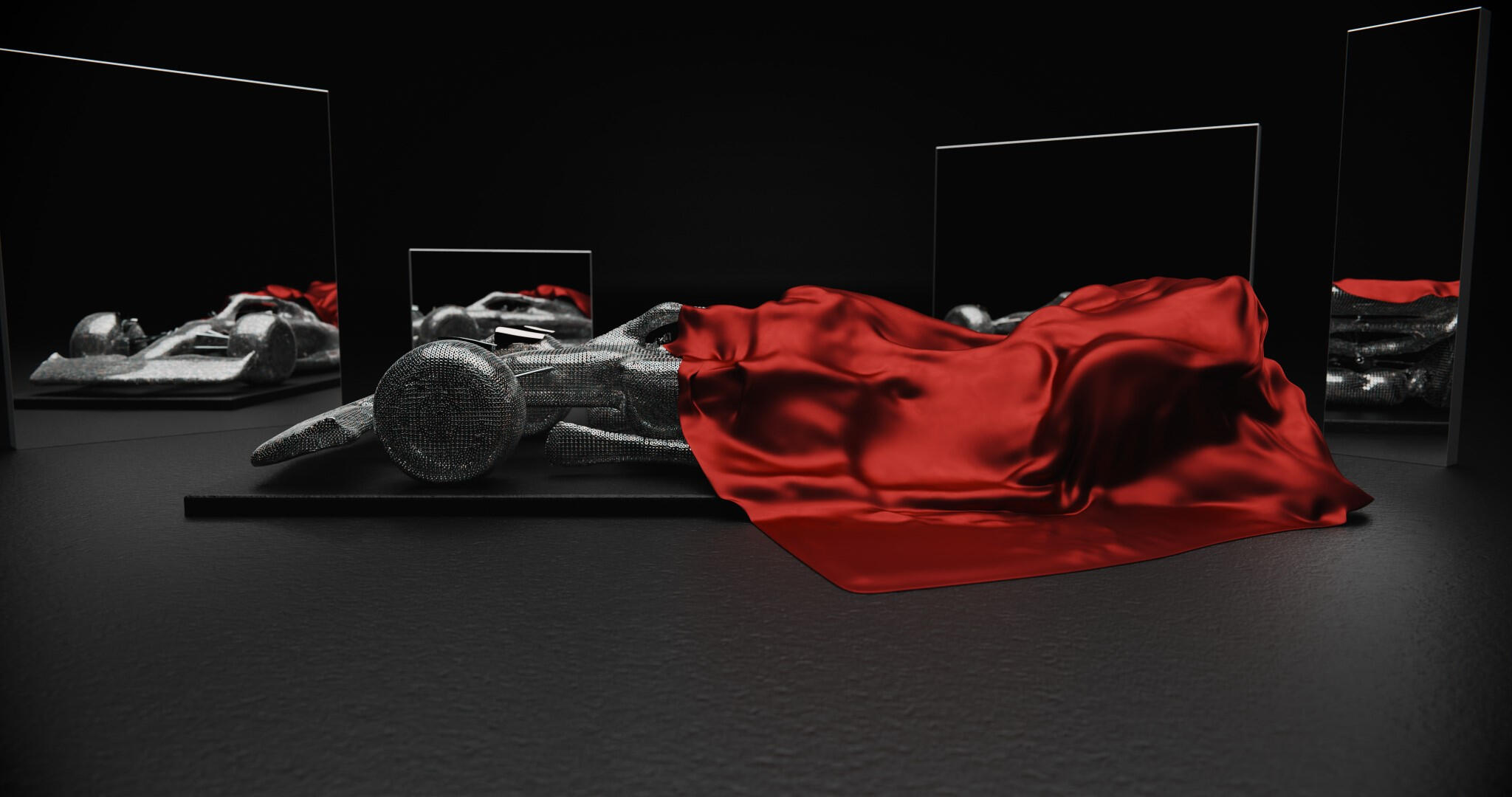 Goal: Produce a high-fidelity 3D visualization of a Formula 1 car sculpture, composed of 84,300 individual metal nuts, to provide visual context for an existing commission from the Mercedes F1 2022 team.